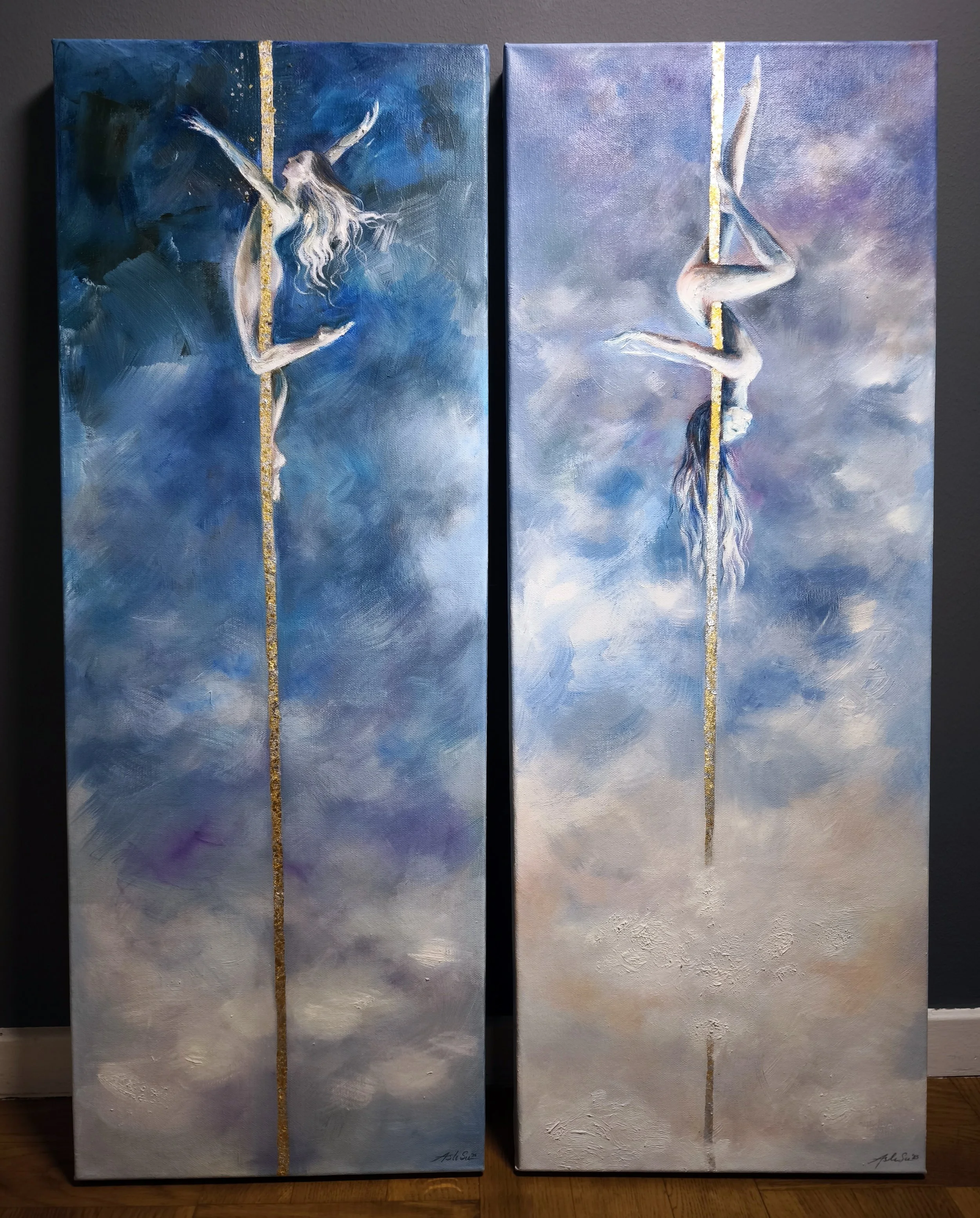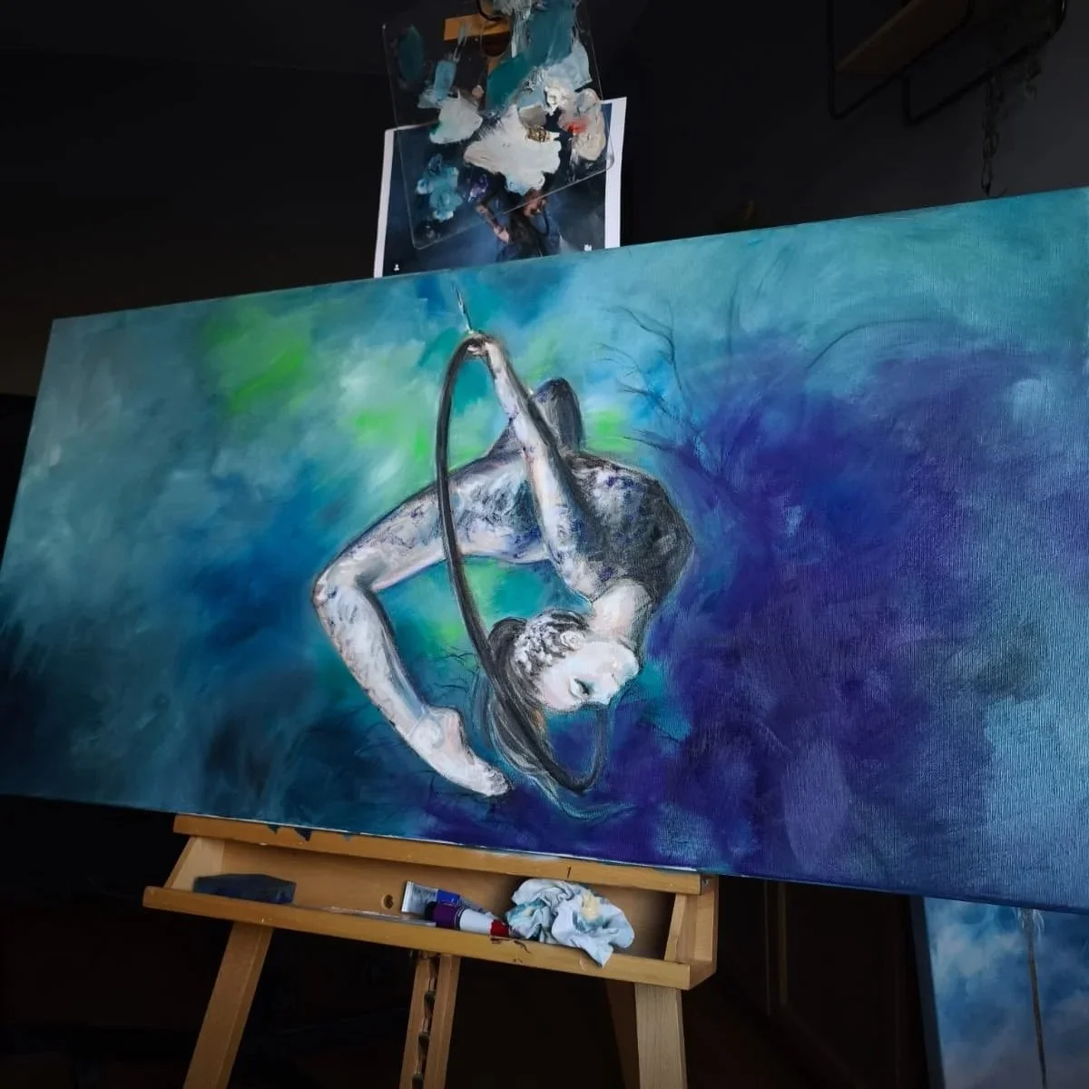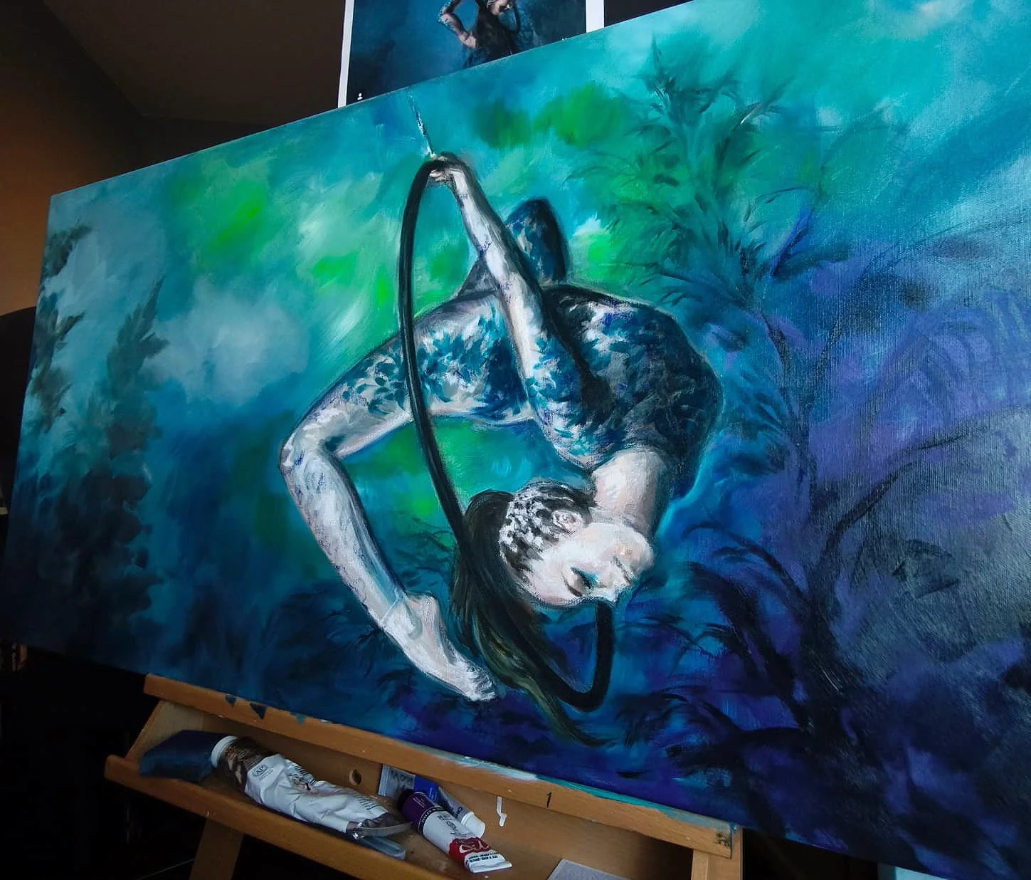 My paintings are meant to take you where your soul finds peace, whether dancing among luminous clouds or flying freely through an aurora-lit sky. Through my continued studies of the human form and stylized figures, especially dancers and aerialists, I bring a sense of graceful dynamism and physical presence, juxtaposed against dreamy, serene landscapes.