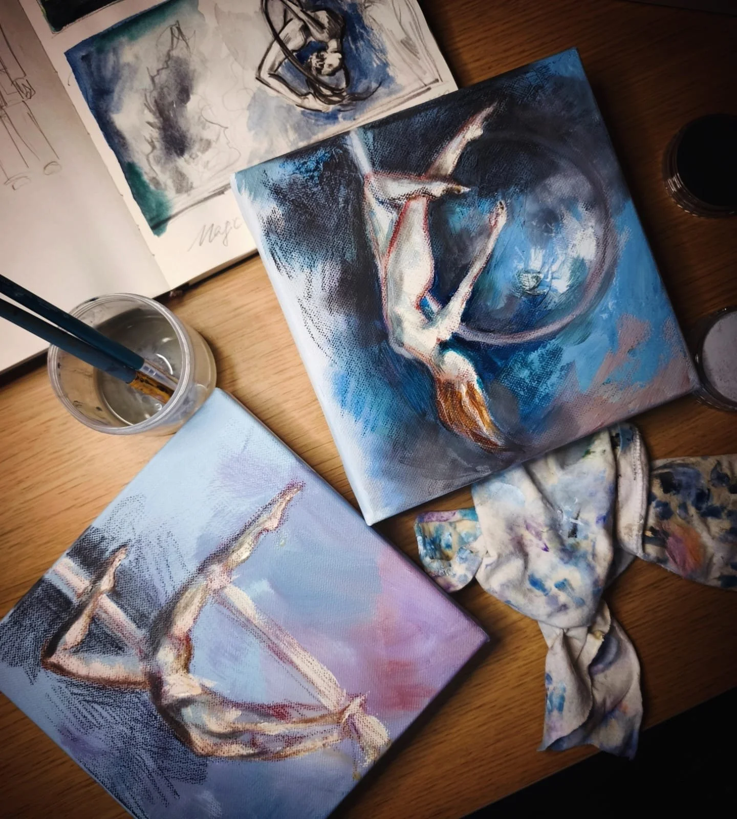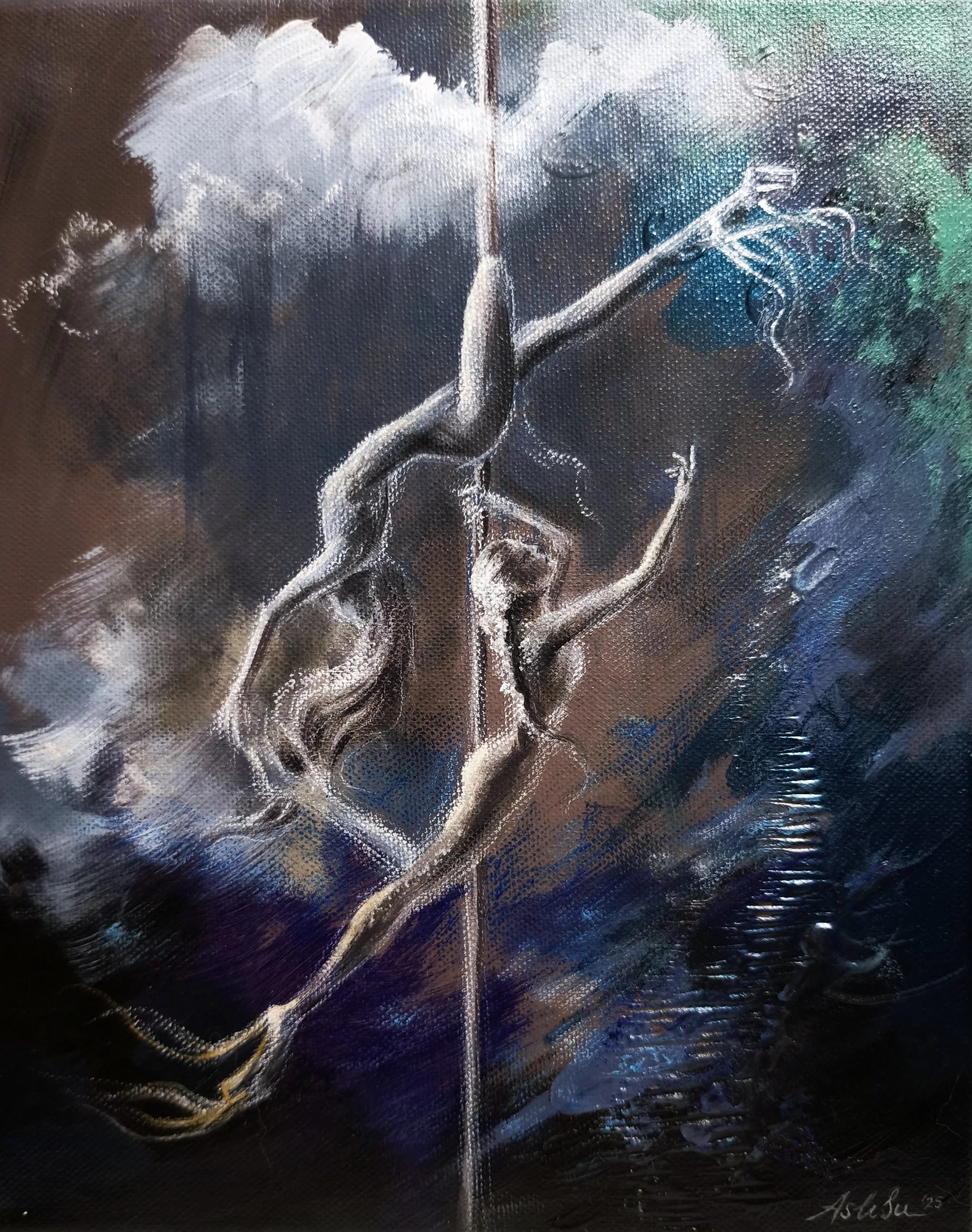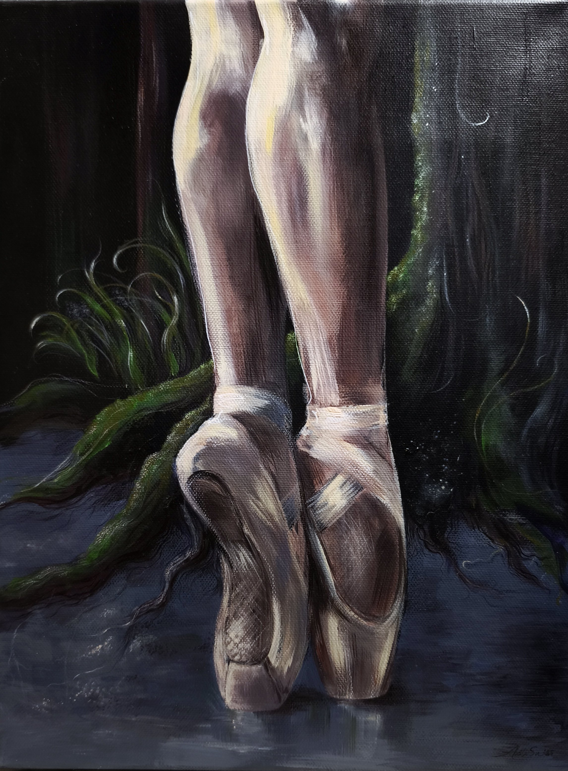 My paintings are meant to take you where your soul finds peace, whether dancing among luminous clouds or flying freely through an aurora-lit sky. Through my continued studies of the human form and stylized figures, especially dancers and aerialists, I bring a sense of graceful dynamism and physical presence, juxtaposed against dreamy, serene landscapes.