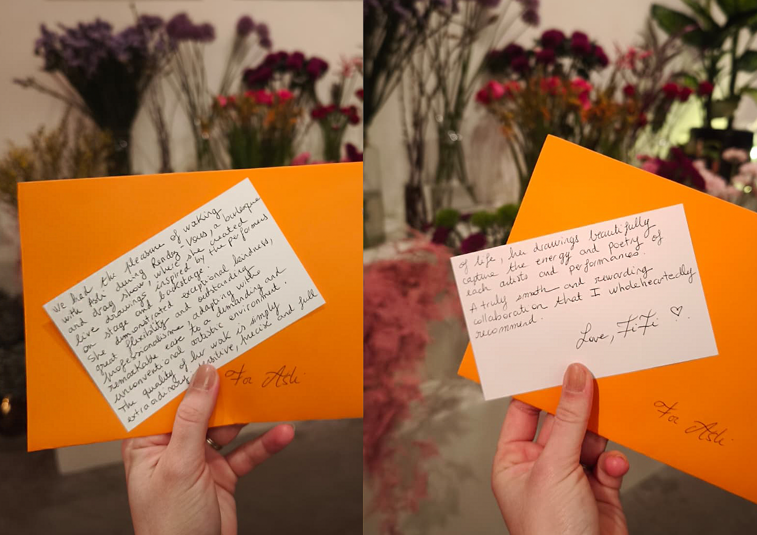 "We had the pleasure of working with Asli during Rendez-Vous, a burlesque and drag show, where she created live drawings inspired by the performers on stage and backstage. She demonstrated exceptional kindness, great flexibility and outstanding professionalism, adapting with remarkable ease to a demanding and unconventional artistic environment. The quality of her work is simply extraordinary: sensitive, precise and full of life, her drawings beautifully captured the energy and poetry of each artist and performance. A truly smooth and rewarding collaboration that I wholeheartedly recommend."
